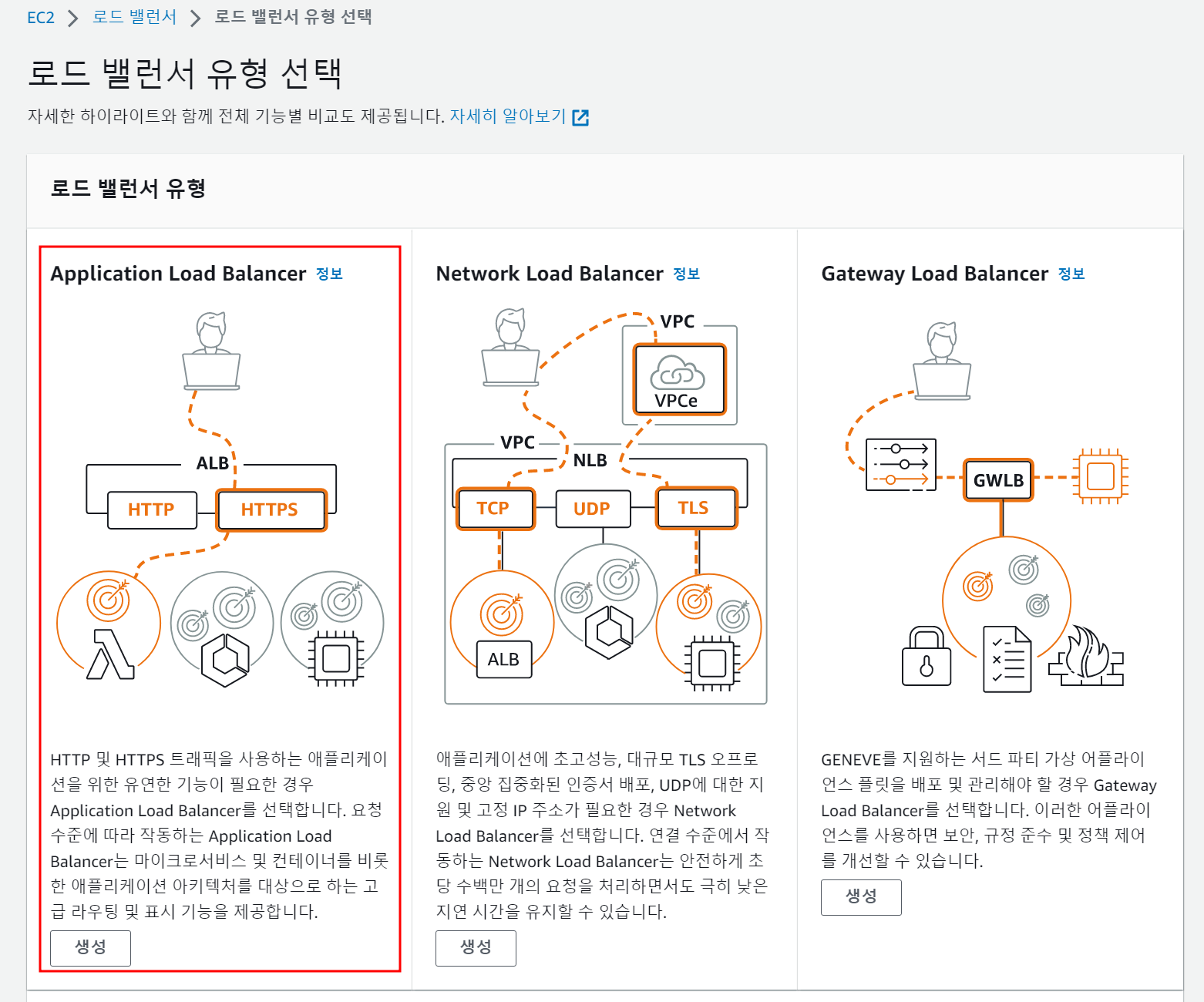EC2 > 로드 밸런싱 > 로드 밸런서, 로드밸런서 생성에서 Application Load Balancer를 선택