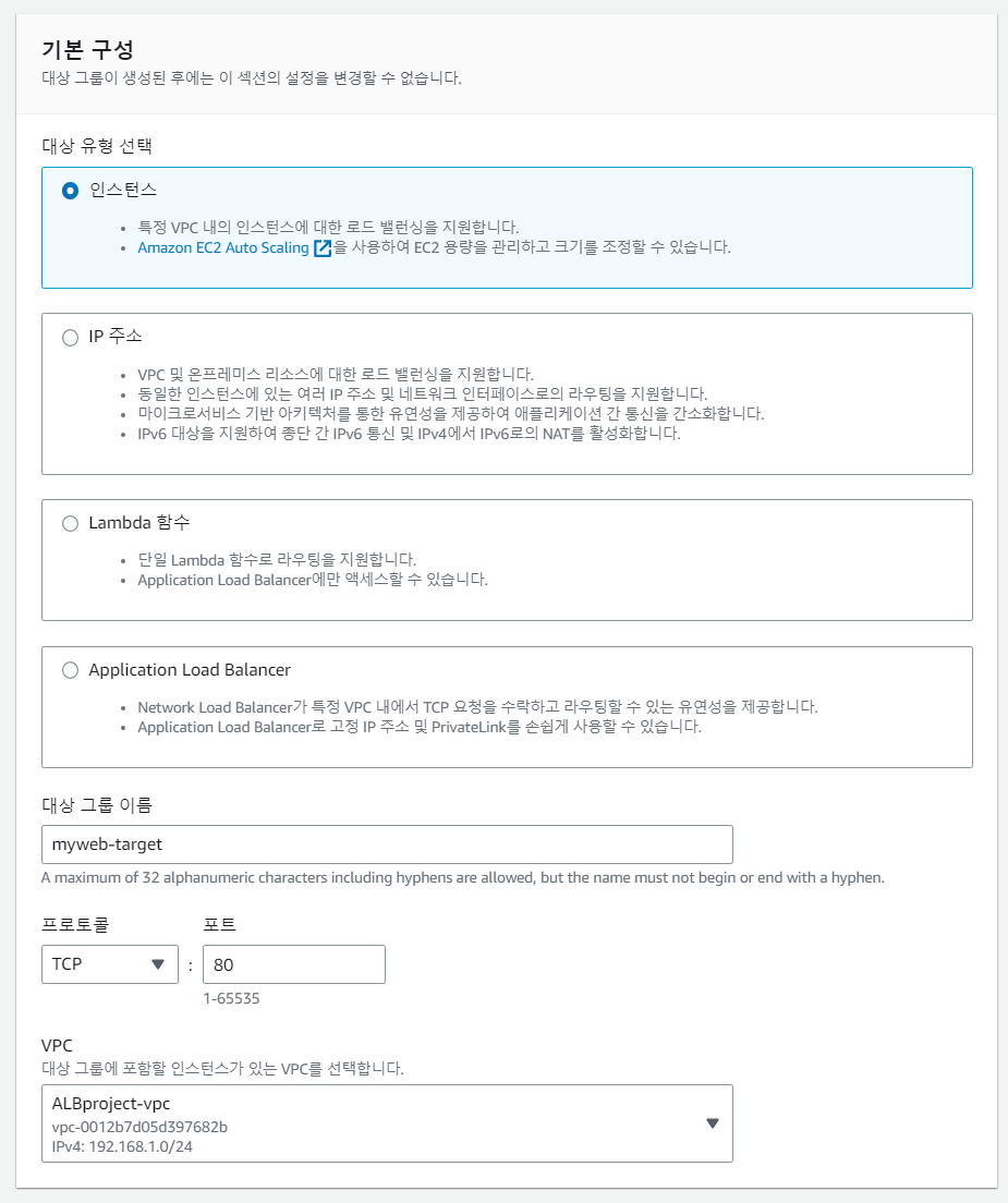 대상 유형 : 로드밸런서와 연결될 대상의 유형, 인스턴스, IP주소, Lambda 함수