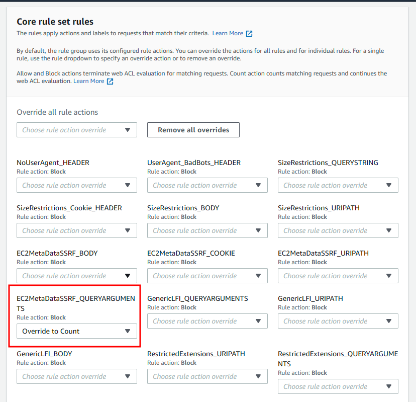 Managed Rule 세팅에서는 다음과 같은 rule group들을 볼 수 있다.