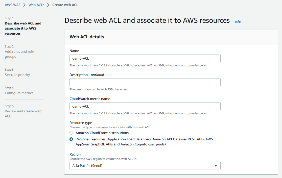 중간에 보이는 Web ACL capacity units는 rule과 rule group들에 대해 매긴 가중치로, webACL 별로 rule들의 가중치 합이 1500을 넘길수 없다.