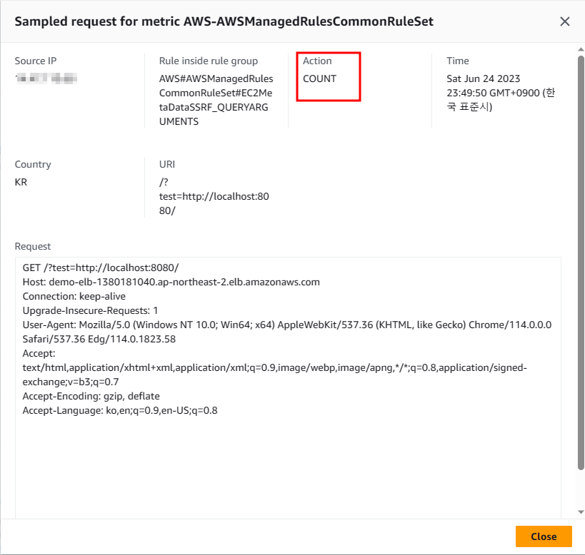 WAF 탐지내용에 EC2MetaDataSSRF_QUERYARGUMENTS 내용으로 잡힌 것을 확인할 수 있다.