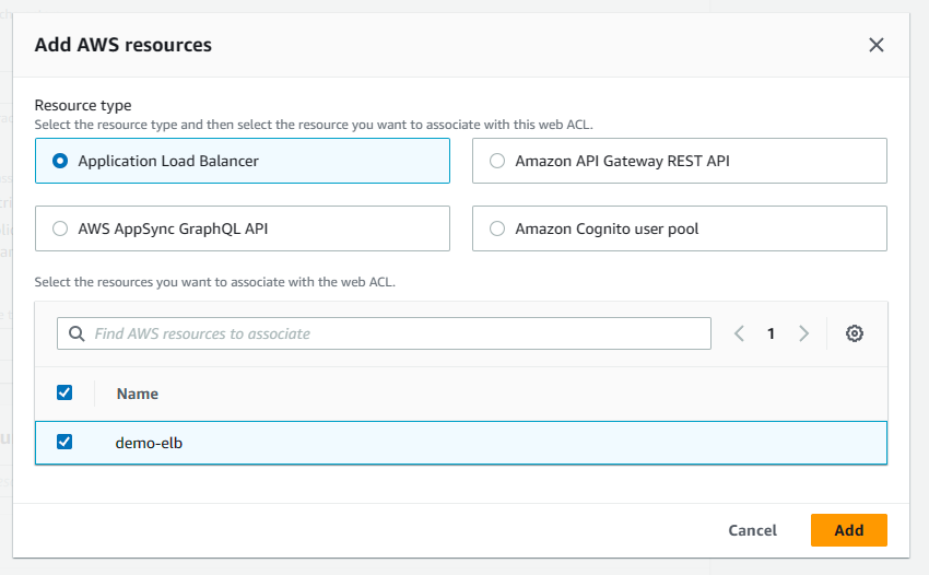하단의 Add AWS resources로 연결할 AWS 서비스를 설정 (ALB를 선택)