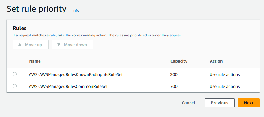 중간에 보이는 Web ACL capacity units는 rule과 rule group들에 대해 매긴 가중치로, webACL 별로 rule들의 가중치 합이 1500을 넘길수 없다.