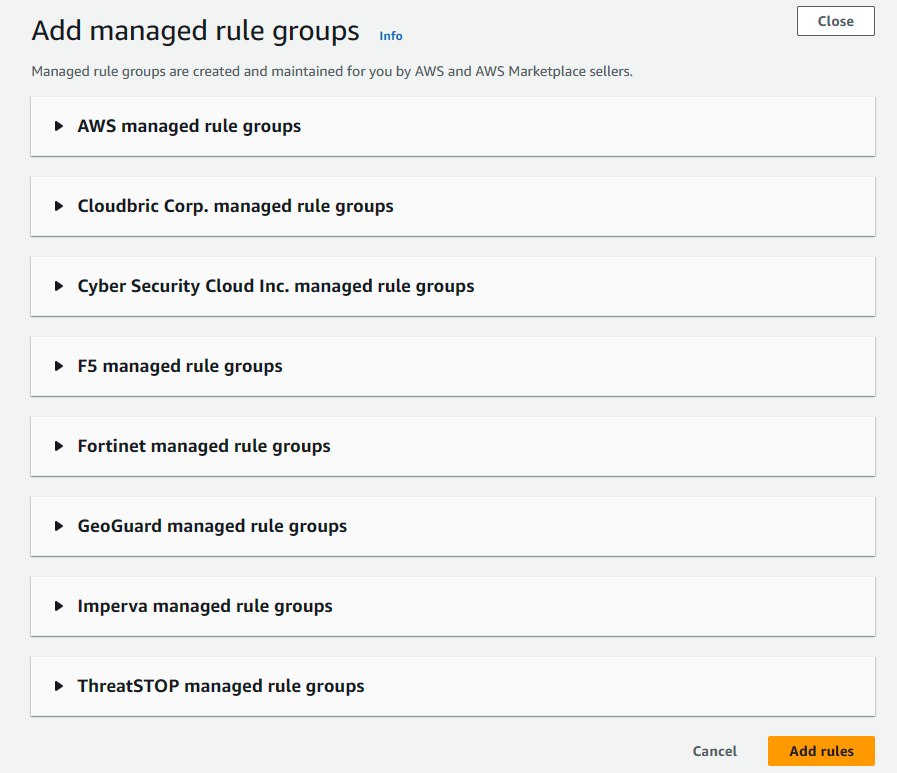 하단의 타 벤더사들의 rule group의 경우 기본으로 제공되는 AWS managed rule group의 성능이 충분하기도 하고, 이것들은 marketplace에서 따로 구독을 해야만 사용할 수 있기도 하여 주로 선택되지 않는다.