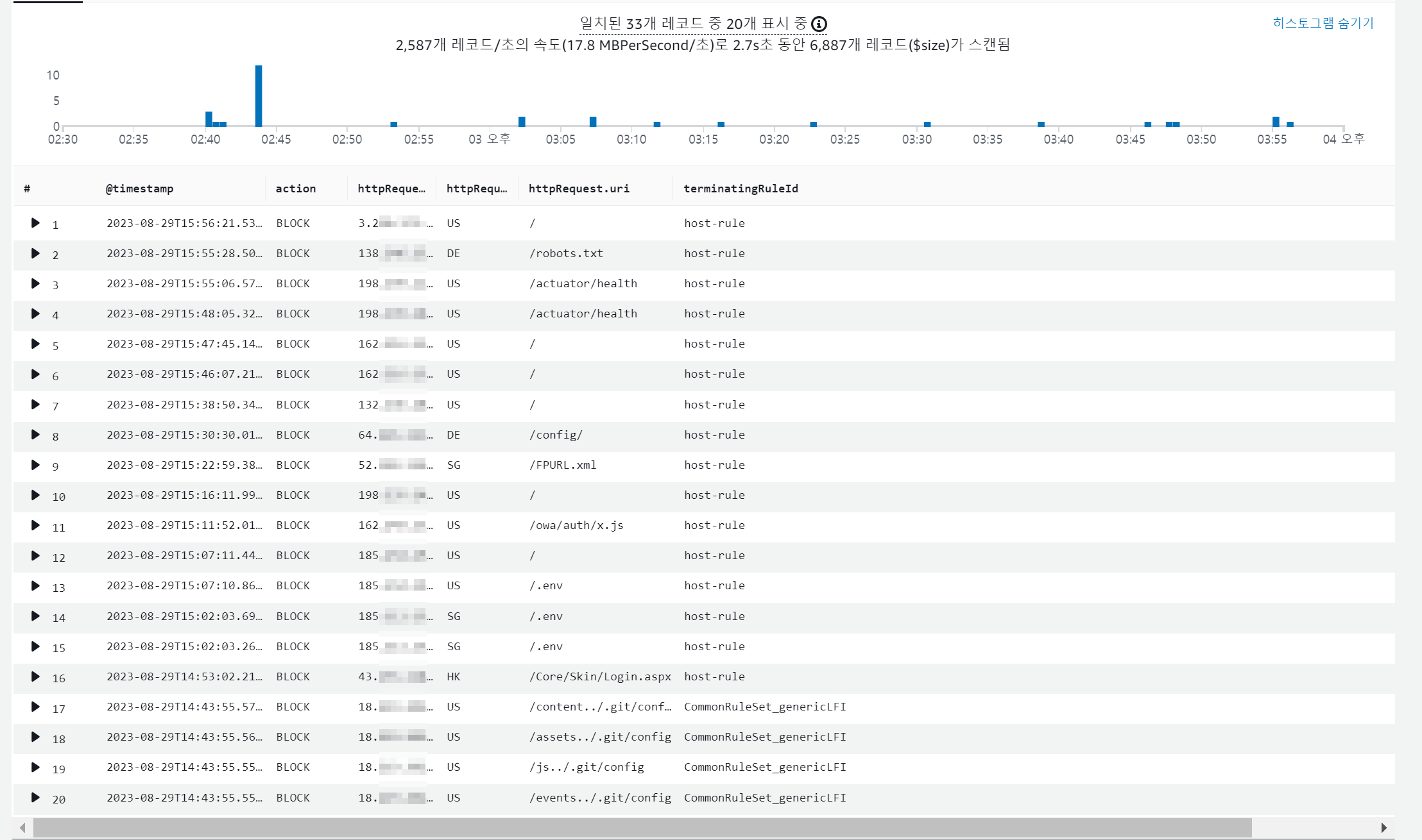 fields @timestamp, action, httpRequest.clientIp, httpRequest.country, httpRequest.uri, terminatingRuleId
