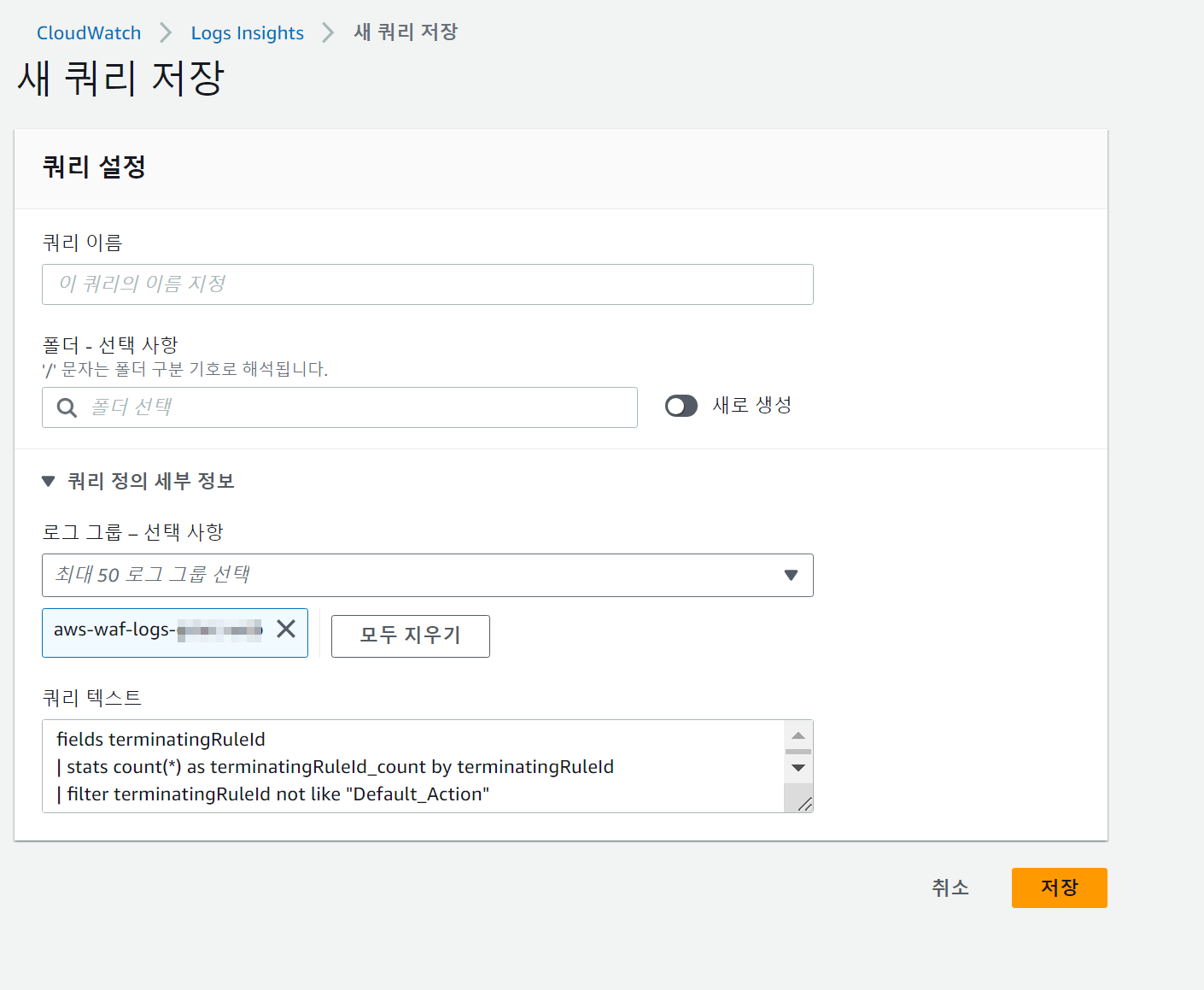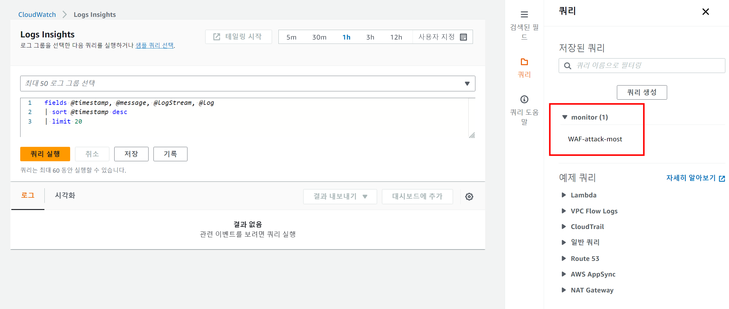 예시로 WAF의 로그그룹에 쿼리를 해본다.