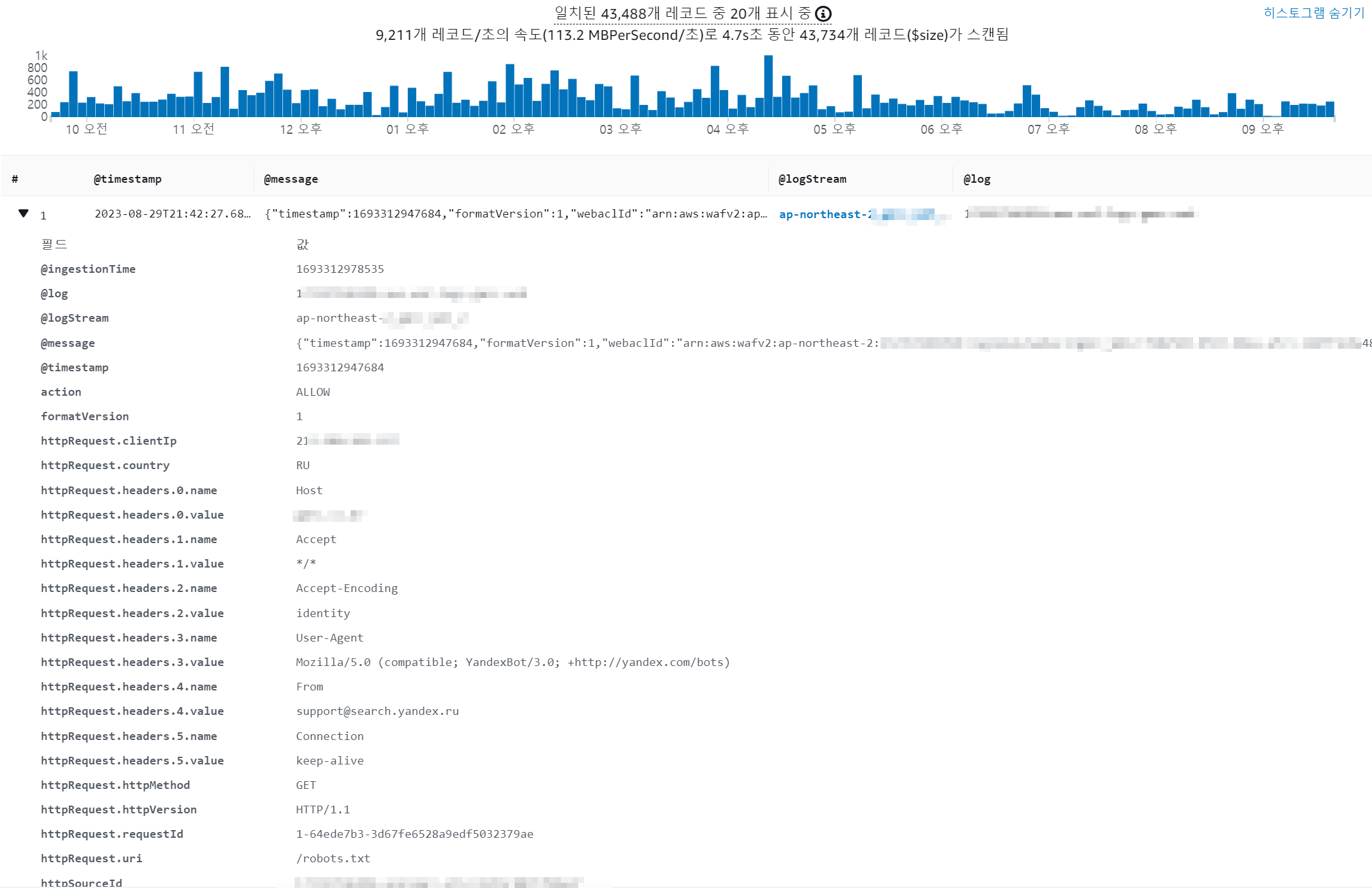 WAF의 로그들을 cloudwatch 로그그룹으로 전송되도록 설정한 후, 로그 그룹에 log insights 쿼리를 쏜다.