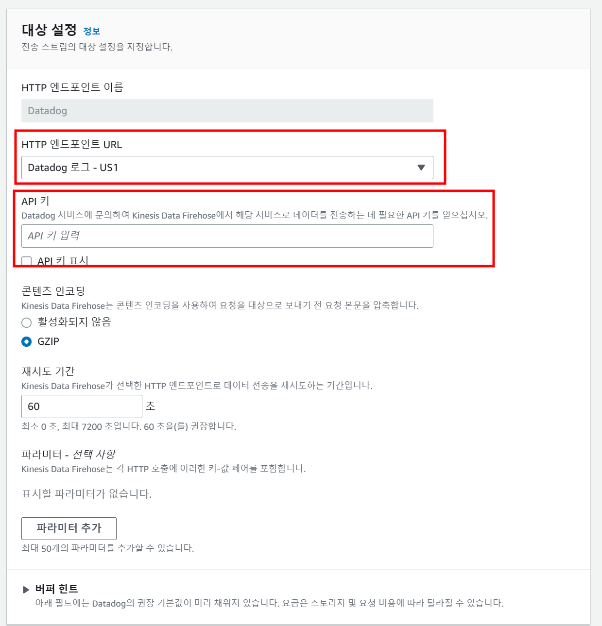 다음으로 대상은 Firehose 스트림이 데이터를 송신할 대상을 지정하는 구간으로, S3나 Opensearch를 비롯한 AWS 서비스 외에도 HTTP 엔드포인트가 존재하는 타사의 3rd party 서비스에도 전송할 수 있다.