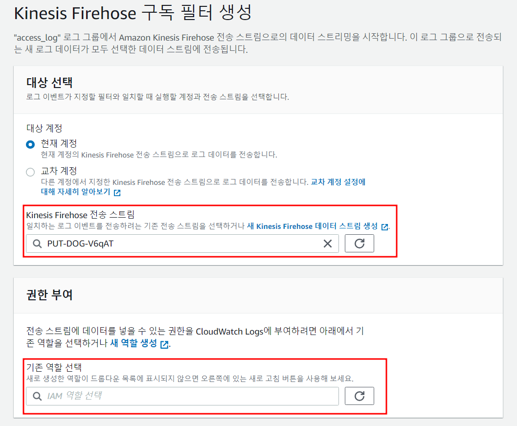 대상으로는 앞서 생성한 Firehose 전송 스트림을 선택 후, 하단의 권한 부여에서 이 스트림에 로그 데이터를 넣을 권한을 cloudwatch log 그룹에 부여한다.