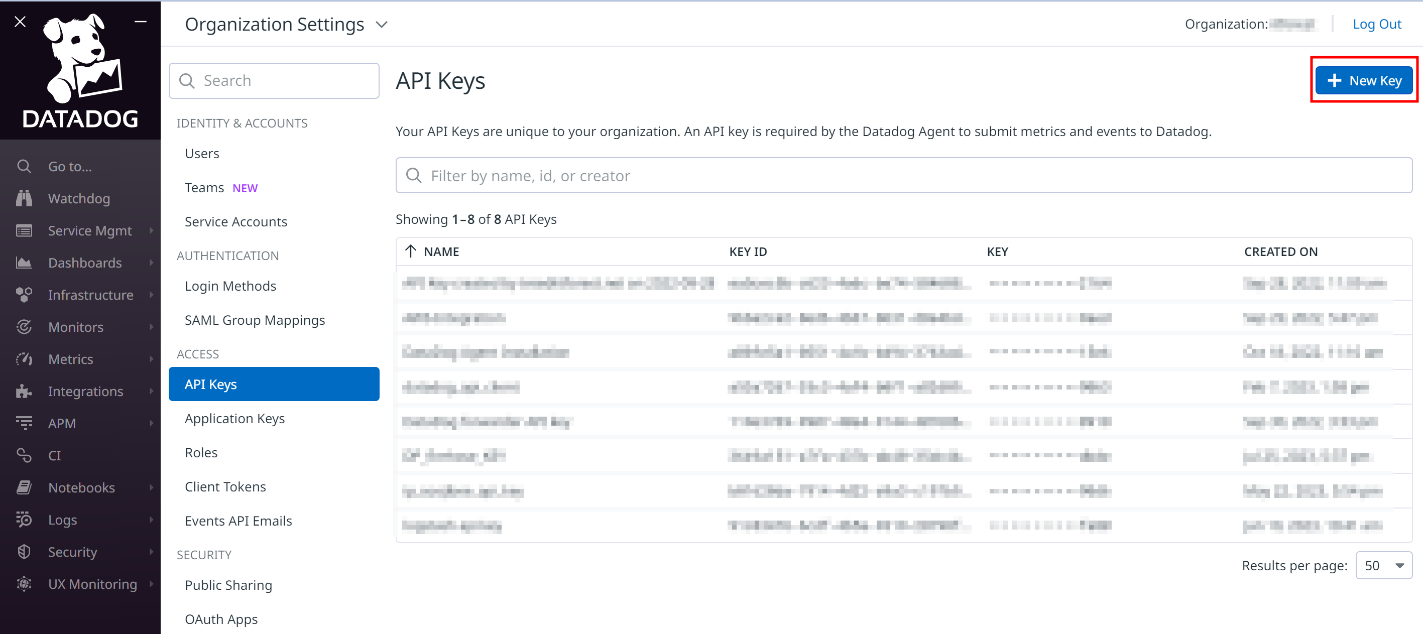 Datadog으로 데이터를 쏴주기 위해 Datadog 계정에서 API Key를 생성해야한다. (Application Key가 아닌 API Key다)