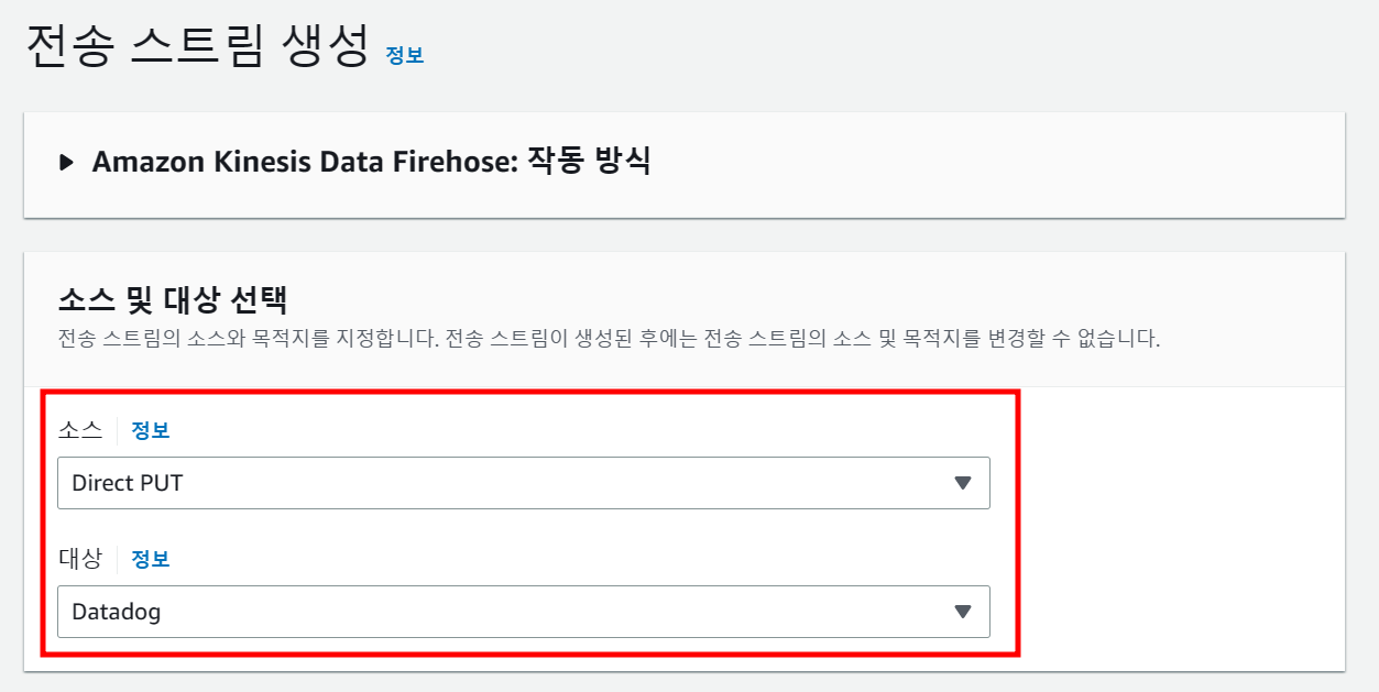 소스는 Firehose 스트림이 수신할 데이터가 타입을 지정하는 구간으로 Kinesis Data Streams와 Direct PUT이 존재한다.