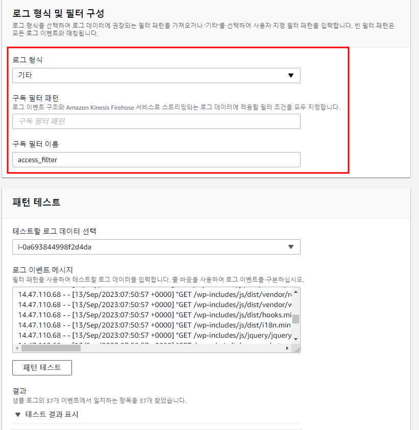 패턴 테스트를 통해 지정한 패턴에 맞게 로그데이터들이 검색되는 지 확인 후 구독필터를 생성한다.