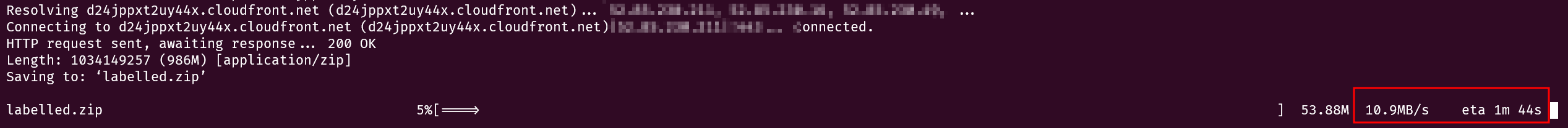 서울에서 파일을 다운받을때의 속도는 약 10mb/s, ETA는 94초로 확실하게 증가한 것을 볼 수 있었다.