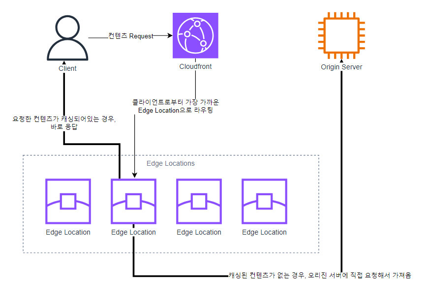 반면, 액세스하고자 하는 컨텐츠가 엣지 로케이션에 저장되어있지 않은 경우에는 Cloudfront는 연결된 오리진에서 컨텐츠를 검색 후, 엣지 로케이션에 캐싱 한 후 클라이언트로 전달하게 된다.