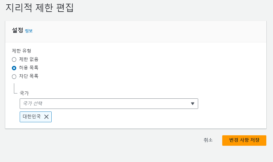 화이트리스트(특정 국가만 접근가능) 방식과 블랙리스트(특정 국가의 접근을 제한) 방식 중 선택하여 설정 가능하다.