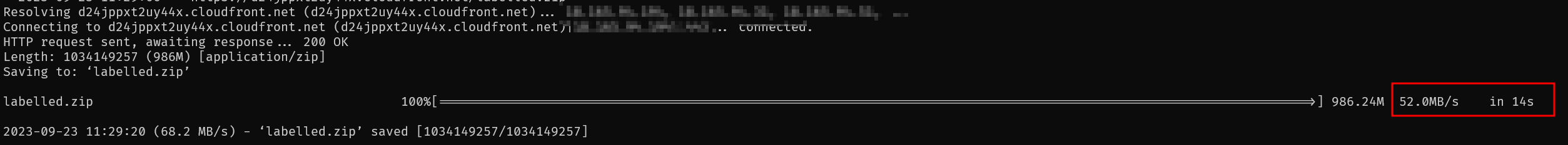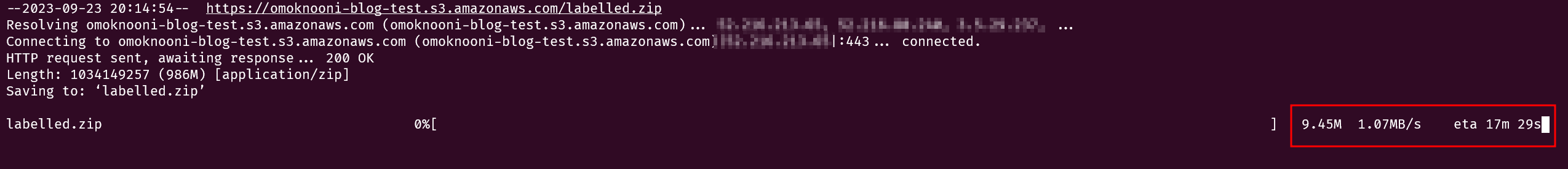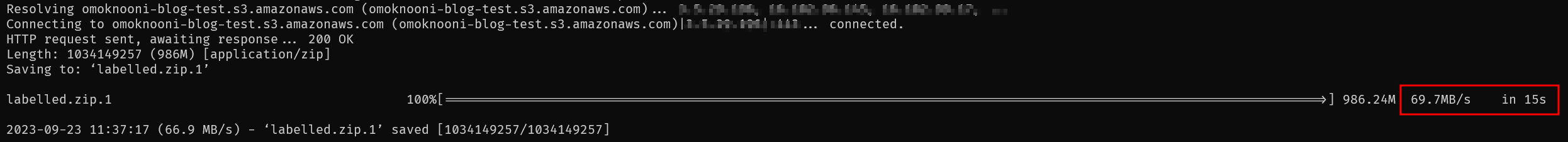 동일한 리전에서 버킷 object를 다운받을때의 모습이다. 속도는 대략 6~70mb/s, ETA까지는 약 15초 걸리는 것을 볼 수 있었다.