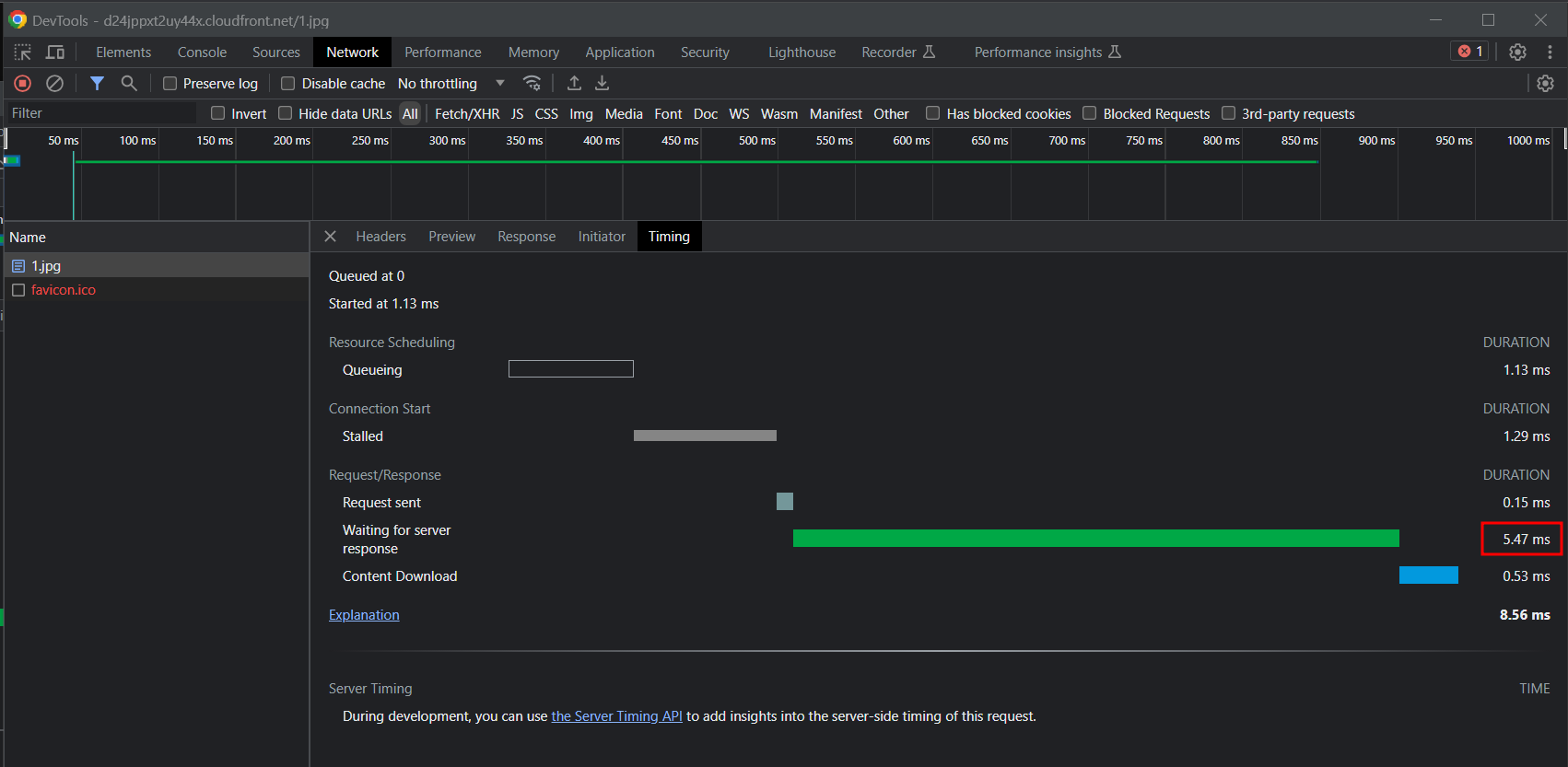 cloudfront 배포 URL로 액세스하는 경우, 평균 10ms 이하로 로딩이 됨을 볼 수 있었다.