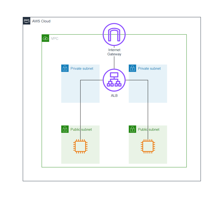 ALB 1개와 2쌍의 서브넷, 2개의 인스턴스로 구성된 아주 전형적인 ALB 아키텍쳐이다.