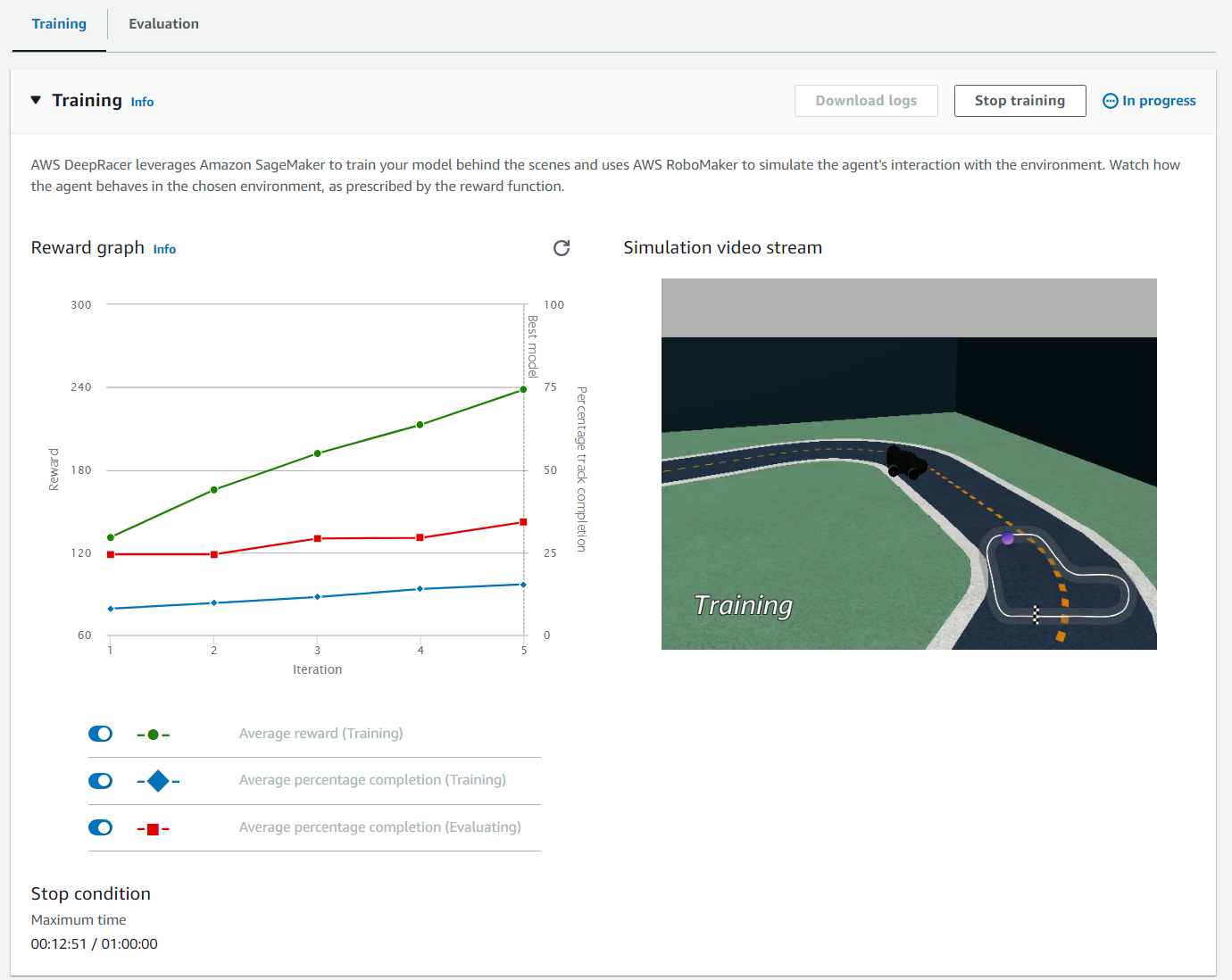 AWS에서 제공하는 강화학습을 통한 레이싱 시뮬레이션, 복잡한 강화학습 과정을 간단한 UI로써 진행하며 모델을 생성하고 평가할 수 있는 자체 서비스이다.