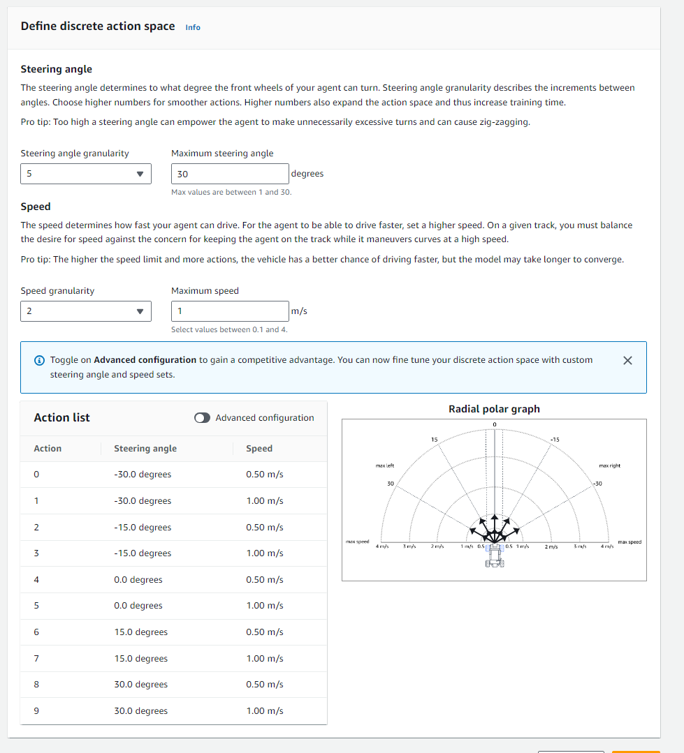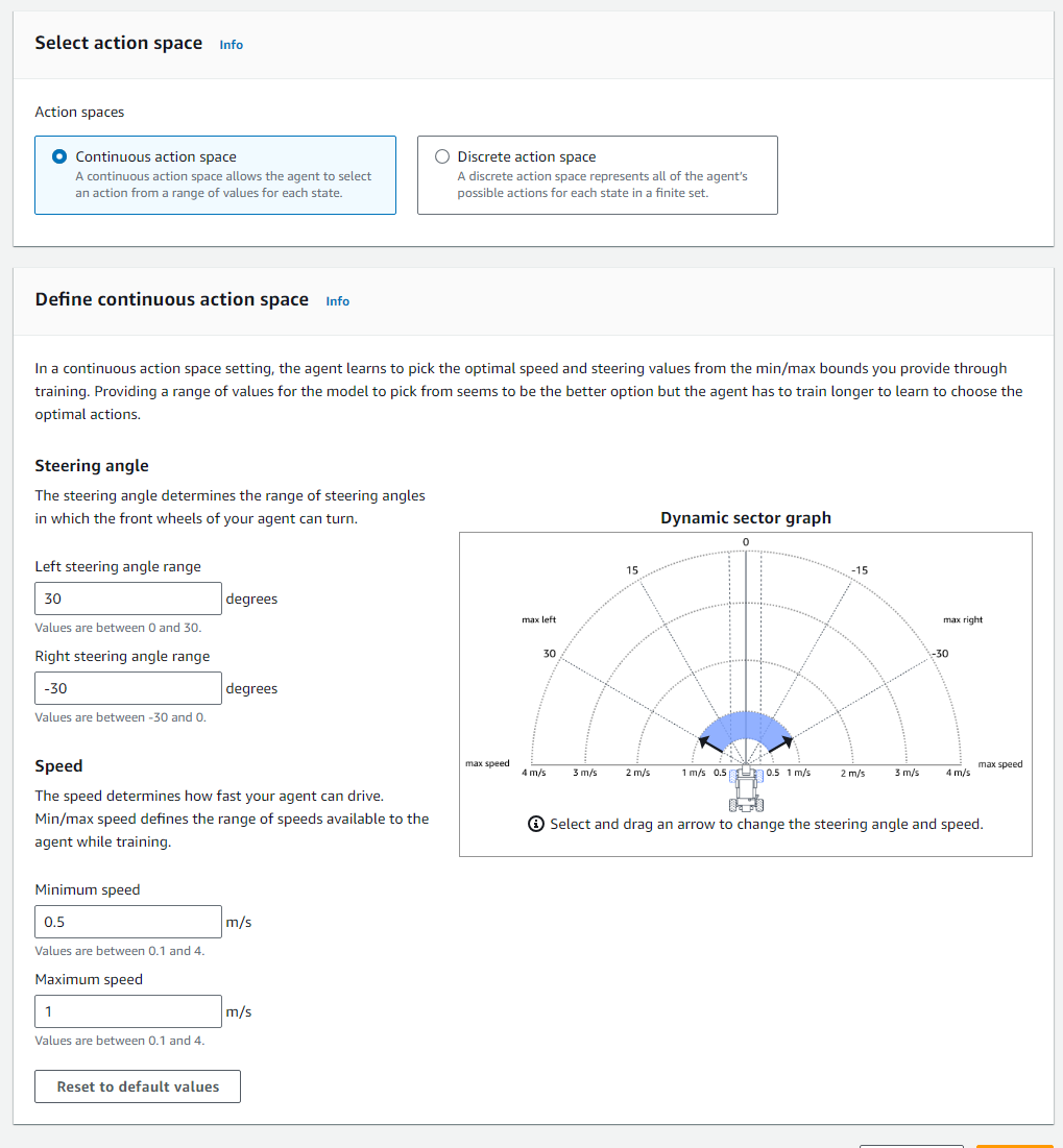 Action space는 에이전트가 취할 수 있는 행동의 집합으로 DeepRacer는 속도와 회전각 2가지 지표를 가지고 Action space를 만들 수 있다.