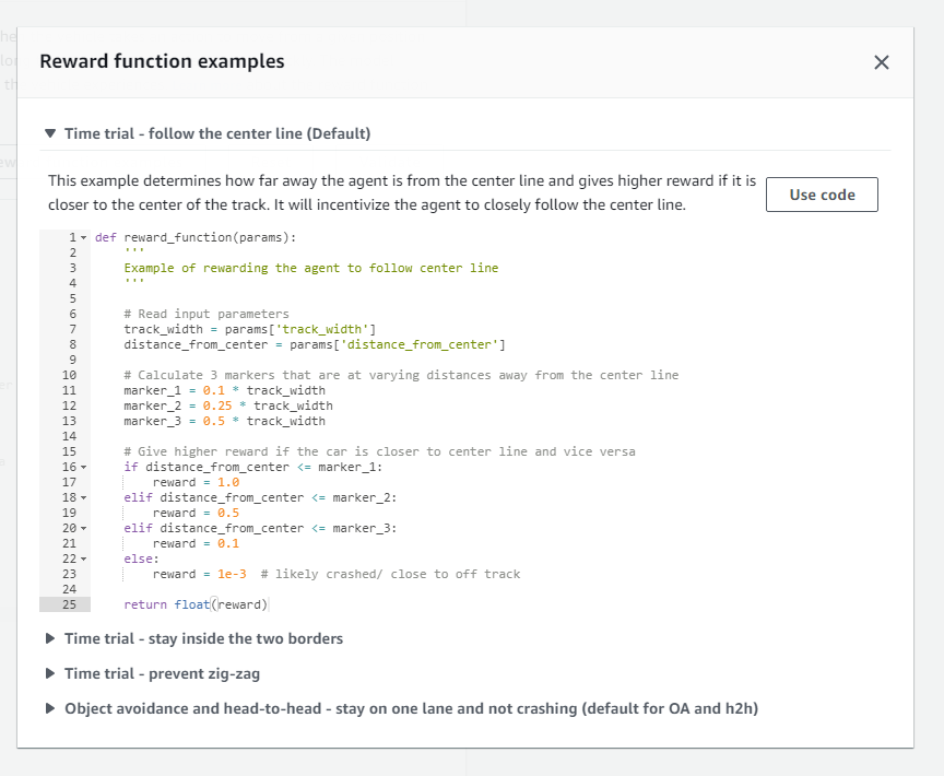 예시로 주어진 reward 제공 방법은 중앙선 따라가기와 양측 경계선을 벗어나지 않기, 지그재그 행동을 방지로 input parameter를 통해 현재 agent에 대한 변수, track에 대한 변수, 장애물에 대한 변수를 호출해 그에 맞는
