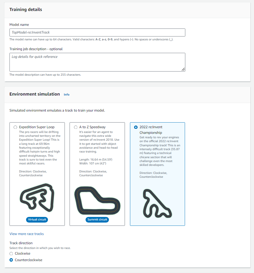 모델 이름과, 설명, Train할 환경(트랙과 주행 방향)을 설정할 수 있다.
