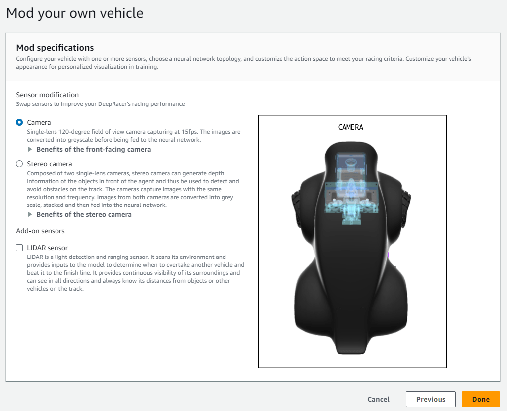 다음으로 차량의 외부 데이터를 수집하기 위해 장착할 센서를 결정하는 부분인데, 카메라와 LIDAR 센서를 장착할 수 있다.