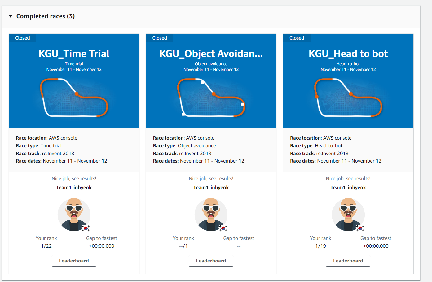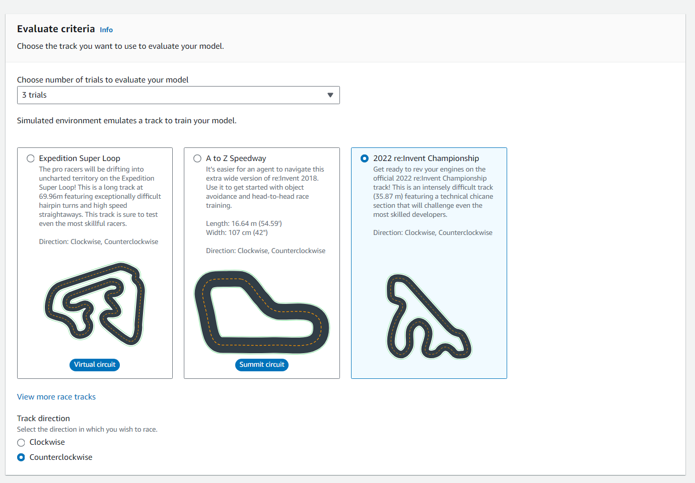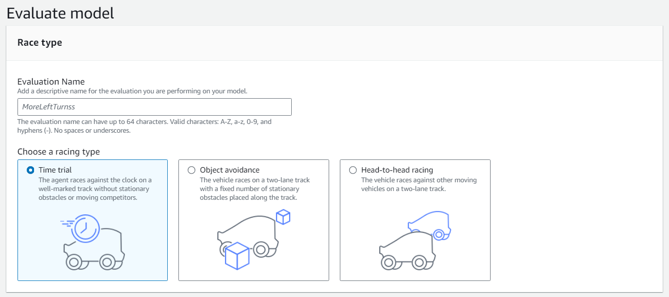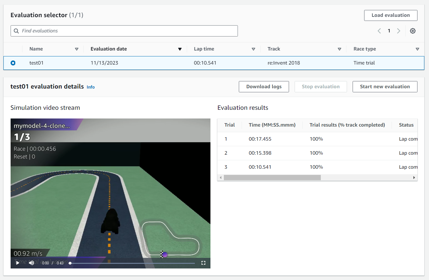 생성한 모델을 Race에 제출하기 전, 트랙에서 돌려보는 최종 평가를 진행한다. Evaluation에서는 episode 횟수를 지정하고, 그 결과값(완주 시간, 완수율, off-track 횟수, 패널티 시간 등)들을 직접 확인할 수 있다.