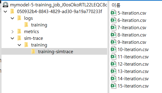 Train 로그파일을 다운로드 받으면 gzip 형태의 압축파일을 볼 수 있는데, sim-trace 내에서 iteration 별로 csv 파일이 기록되어있는 것을 볼 수 있다.