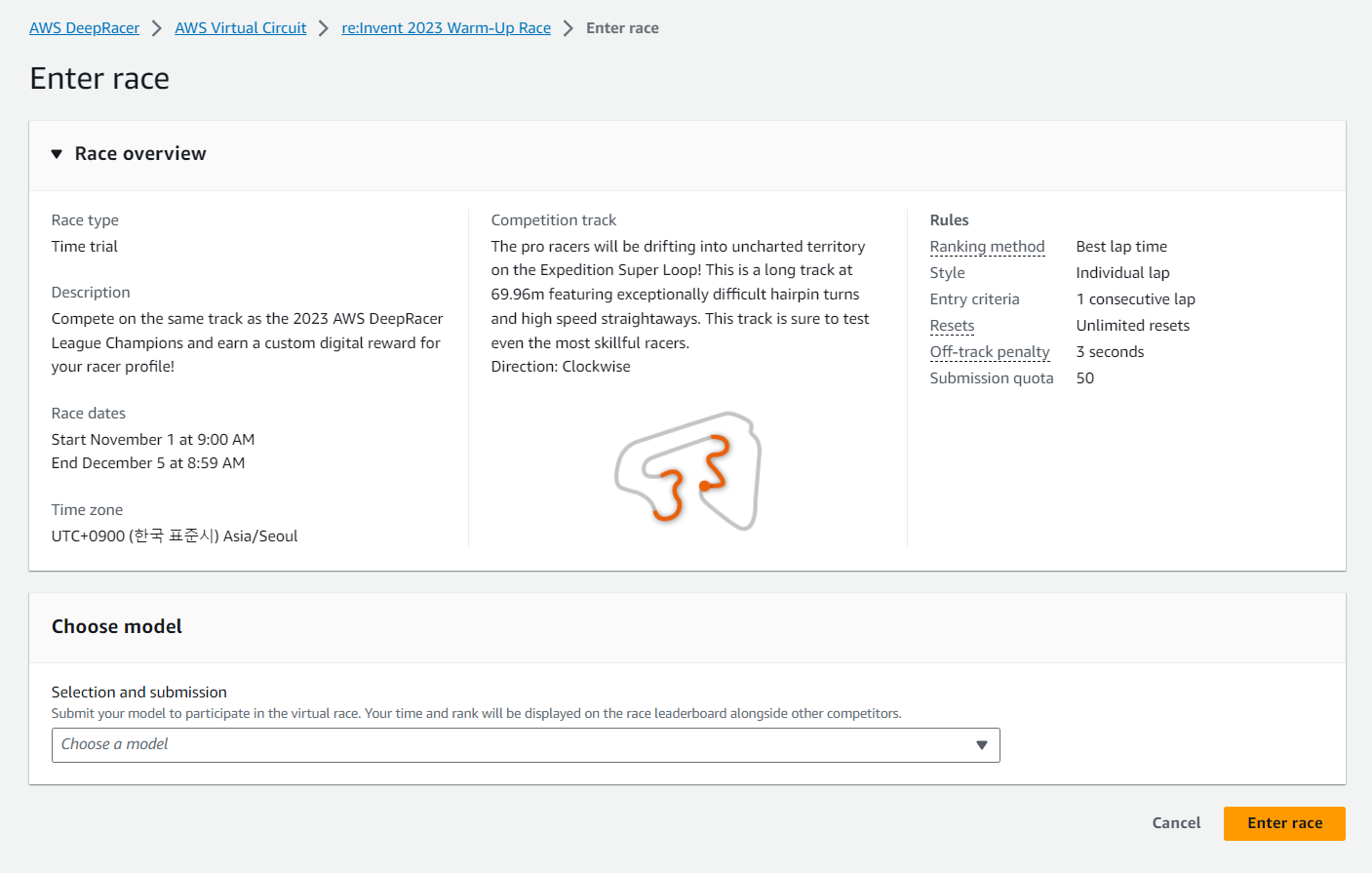 일단 모델이 생성되면 Race에 제출할 수 있다. 제출횟수에 제한은 없어 몇 번이고 같은 모델로 제출할 수 있는데, 팁 아닌 팁으로 횟수가 증가하면 전반적으로 좋은 기록이 찍힌다.