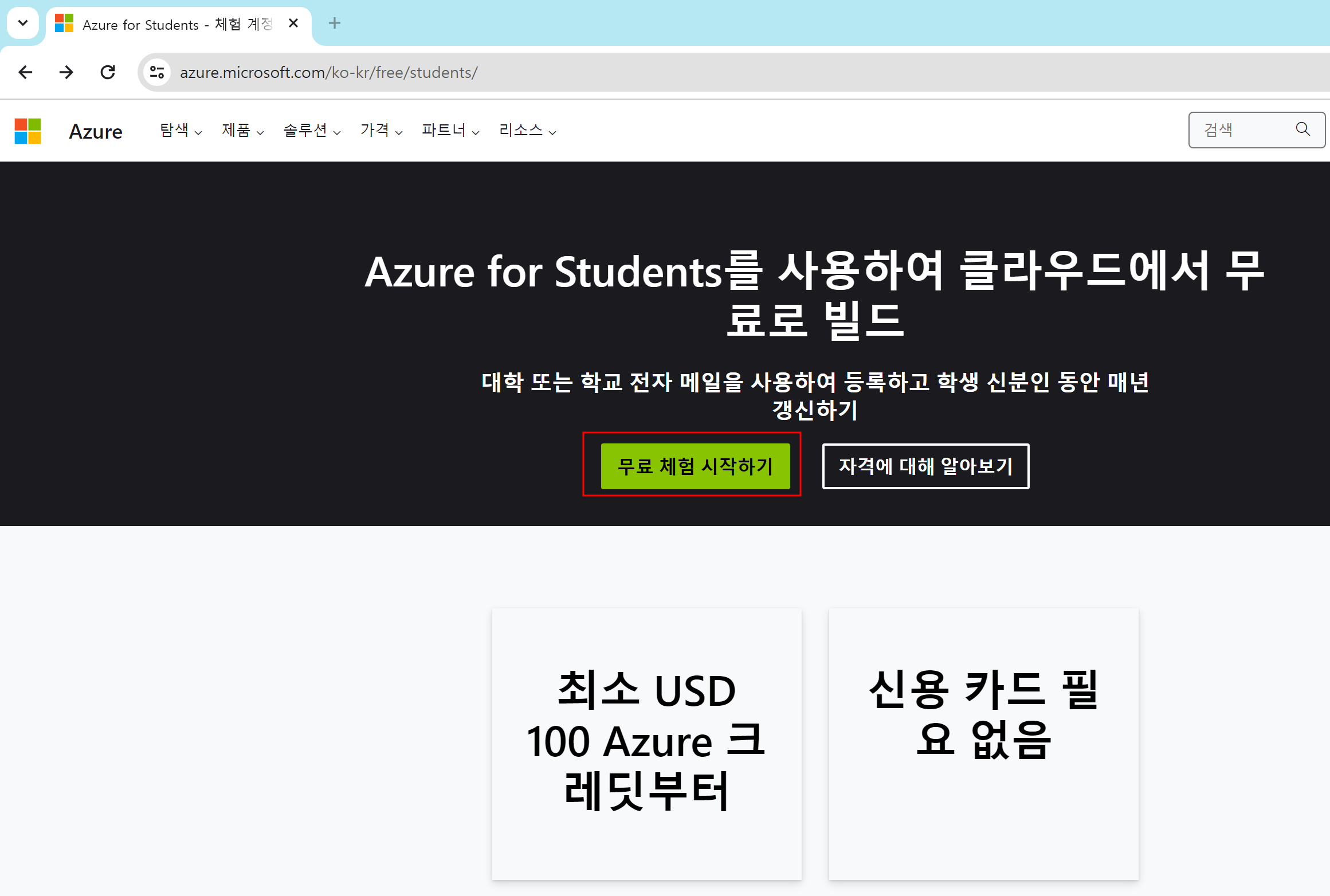 먼저, 아래 링크를 통해 Azure for Students 포털로 들어가 계정을 생성한다.