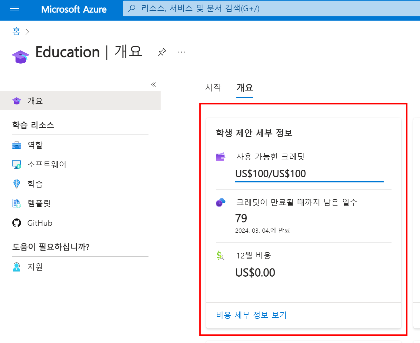 $100 양의 크레딧을 주고, 가입할때에 카드정보를 등록할 필요가 없다고 한다. 보통 다른 퍼블릭 클라우드 서비스들 가입할때에는 카드정보를 입력받지만, Azure for Students는 가입 당시 등록하지 않고 크레딧을 다쓰거나 기간이 끝나면 그때 카드정보를 등록해 종량제로 전환하는 방식이라고 한다.