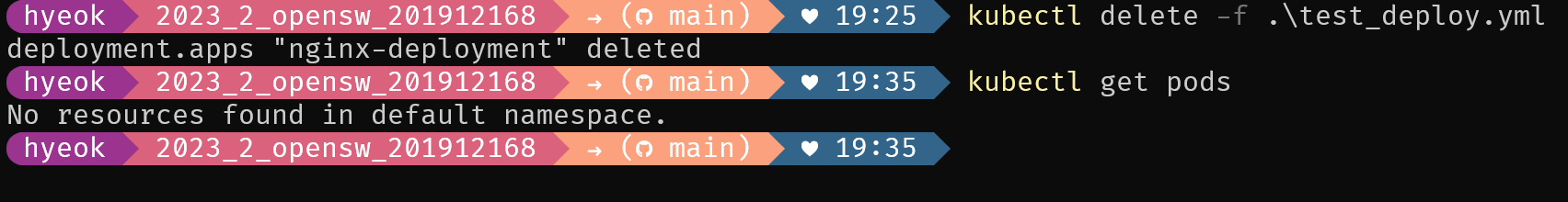 Deployment를 삭제하기 위해 -f 옵션으로 적용 당시의 Manifest 파일을 첨부해준다.