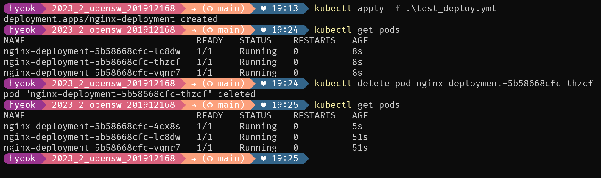 Deployment는 ReplicaSet을 포함하며, ReplicaSet은 명시한 3개의 파드를 유지하고자 한다. 따라서 하나의 파드가 강제로 삭제되어도, 적용한 Manifest 파일에서 명시된 상태를 유지하고자 하는 것이다.