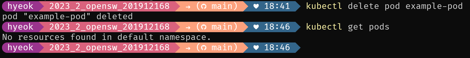 이렇게 생성한 파드를 삭제하기 위해서는 delete 커맨드를 사용할 수 있다.