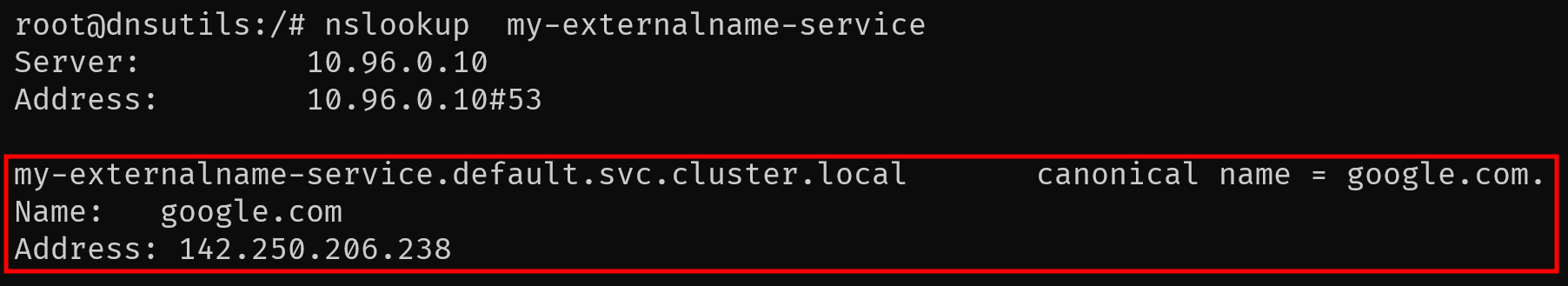 my-externalname-service로 DNS query → ExternalName 서비스가 CNAME 값으로 google.com 반환 → google.com으로 접속