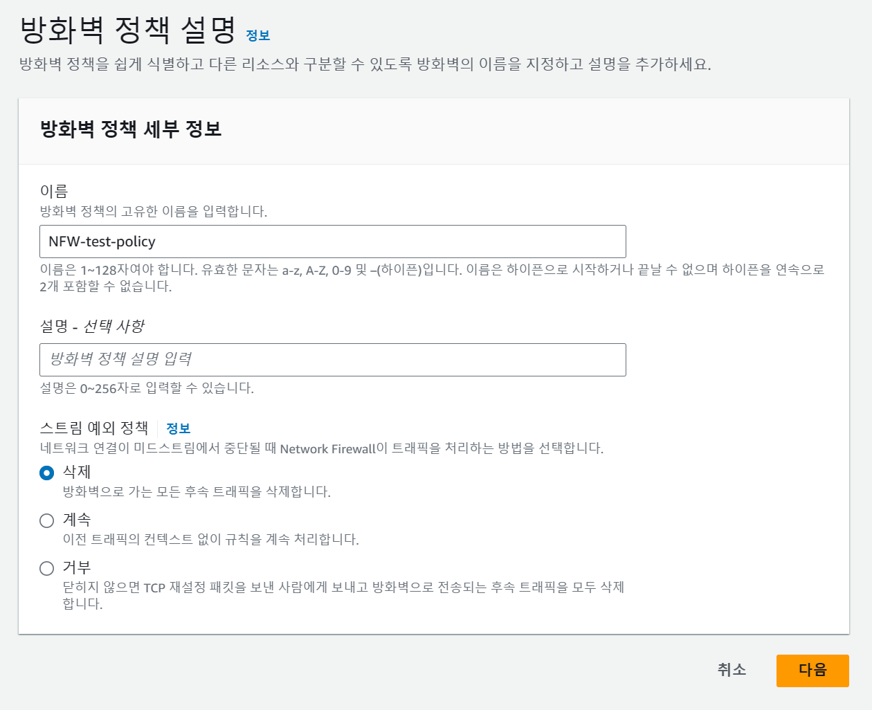 마지막으로 VPC > 네트워크 방화벽 > 네트워크 방화벽 메뉴에서 네트워크 방화벽을 생성한다.
