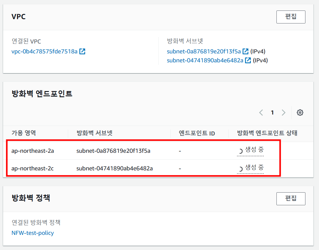 이렇게 네트워크 방화벽을 생성하면 설정한 서브넷 2개에 각각 Firewall Endpoint가 생성되는 것을 볼 수 있다.