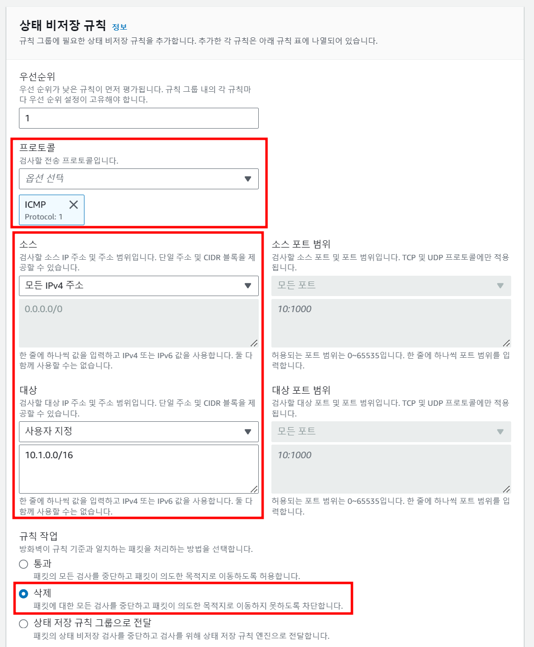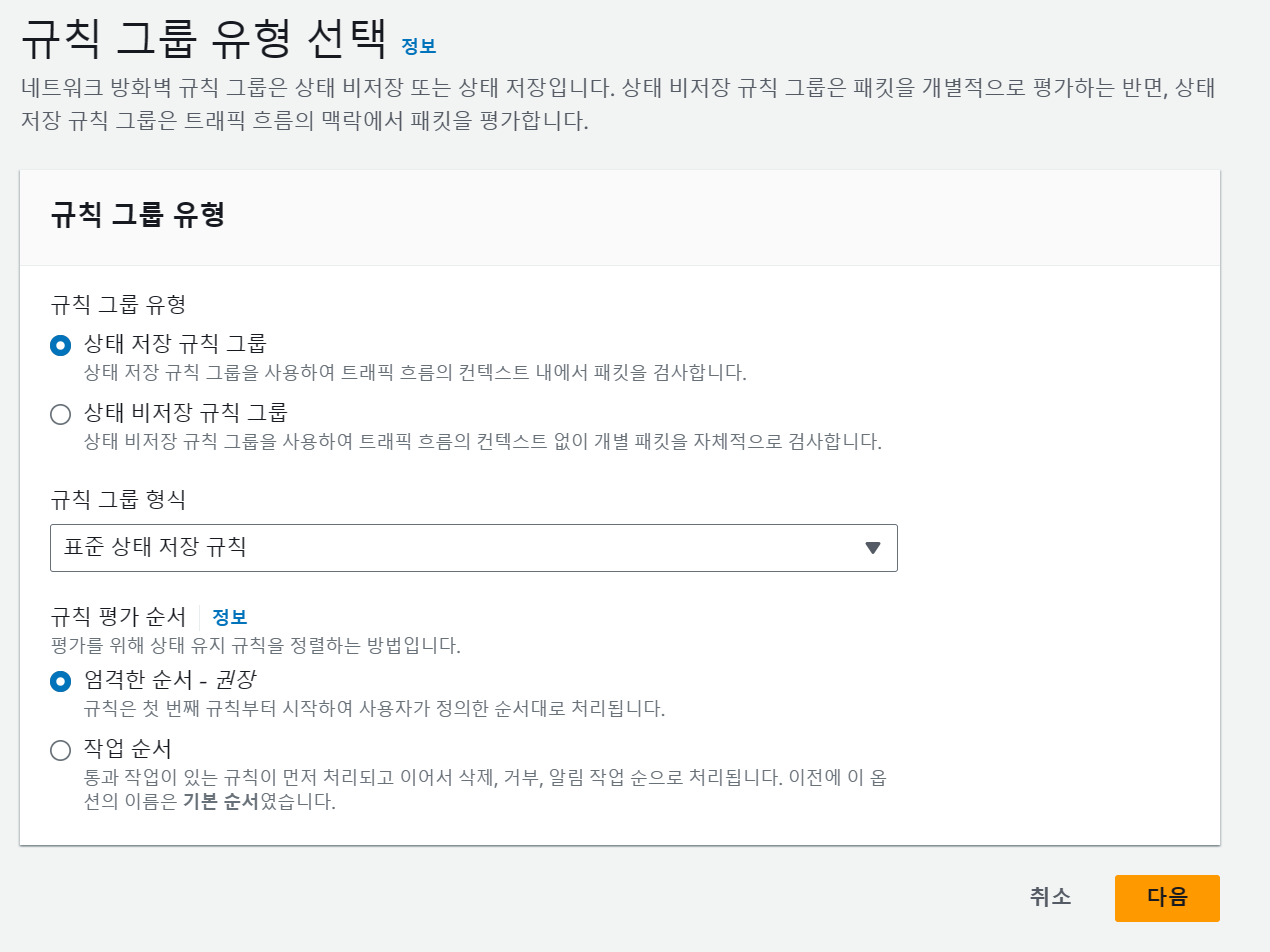 상태 비저장 규칙 그룹에서는 '조각화된 패킷'에 대한 작업을 지정하고, 상태 저장 규칙 그룹에서는 '규칙 평가 순서'를 지정한다.