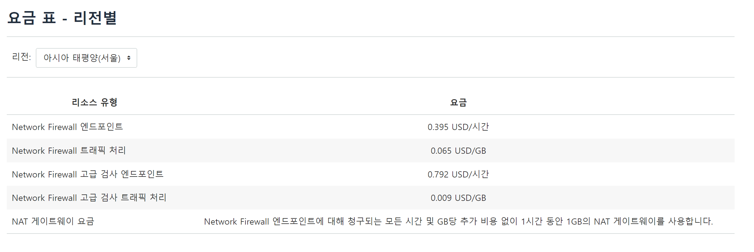 Firewall Endpoint를 생성한 순간부터 요금 측정이 시작되며, Network Firewall에서는 Firewall Endpoint의 가동시간과 처리용량만큼 요금이 부과된다.