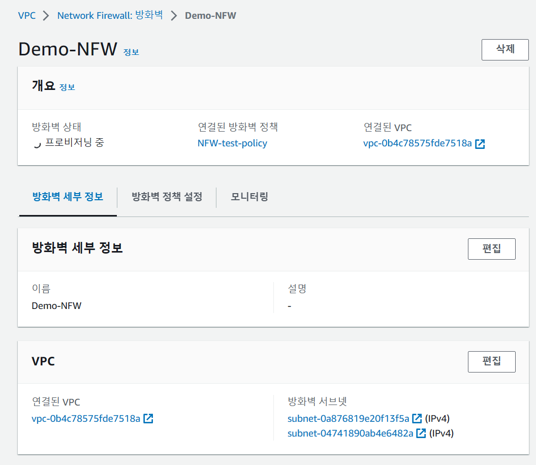 가장 큰 단위인 방화벽은 VPC에 연결되어 방화벽 정책을 기반으로 필터링을 수행하는 객체이다.