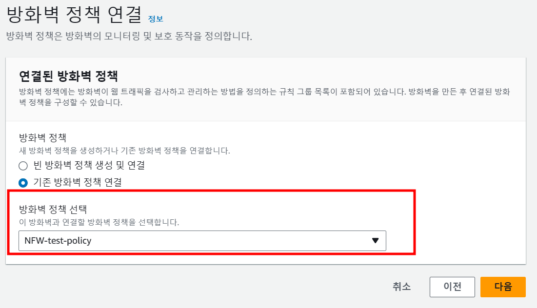 마지막 설정으로 앞에서 생성한 방화벽 정책을 연결해주면 방화벽이 생성된다.