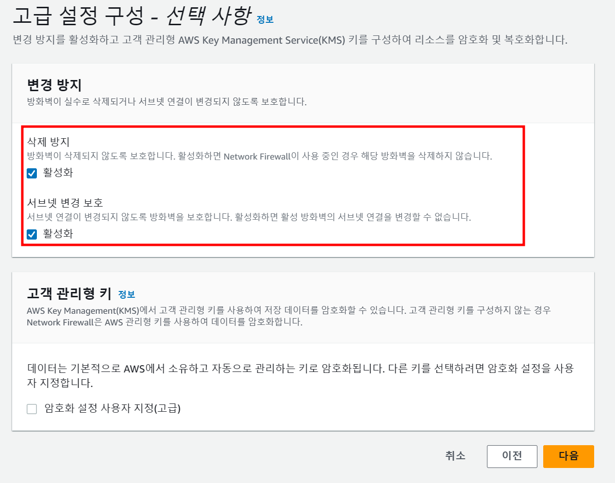 다음 설정은 실수로 방화벽과 서브넷을 변경하는 일을 방지하기 위한 설정으로, 이를 확인하고 넘어간다.
