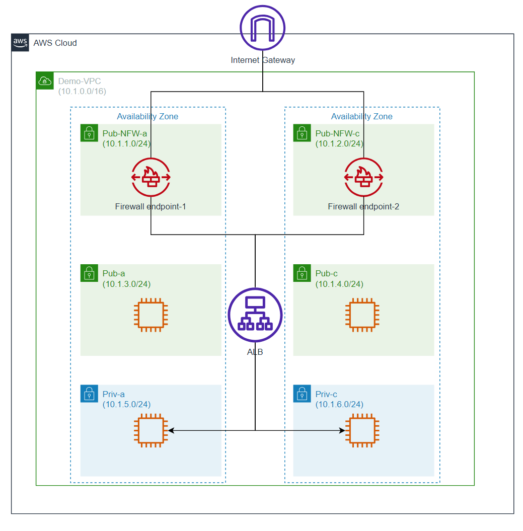 Firewall Endpoint를 VPC의 서브넷에 배치해 Internet Gateway와 내부 리소스의 사이에서 트래픽 제어를 하는 구조이다.