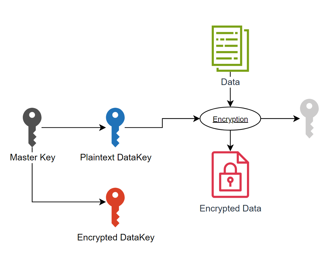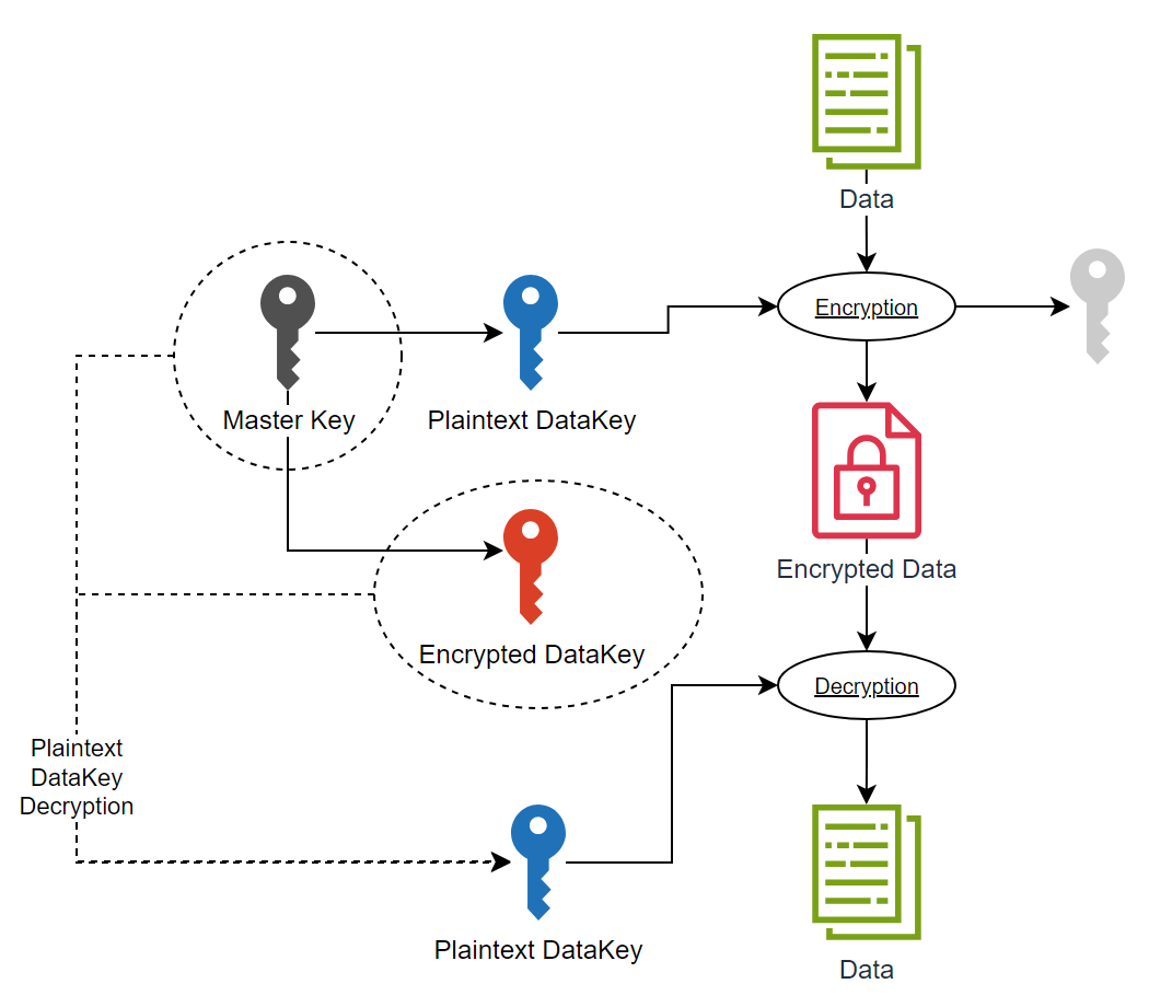 또한, 봉투 암호화는 데이터를 암/복호화하는데에 사용된 Plaintext DataKey가 사용됨과 동시에 폐기되어 암호화에 사용된 키의 탈취가 매우 어렵다는 점이 있다.