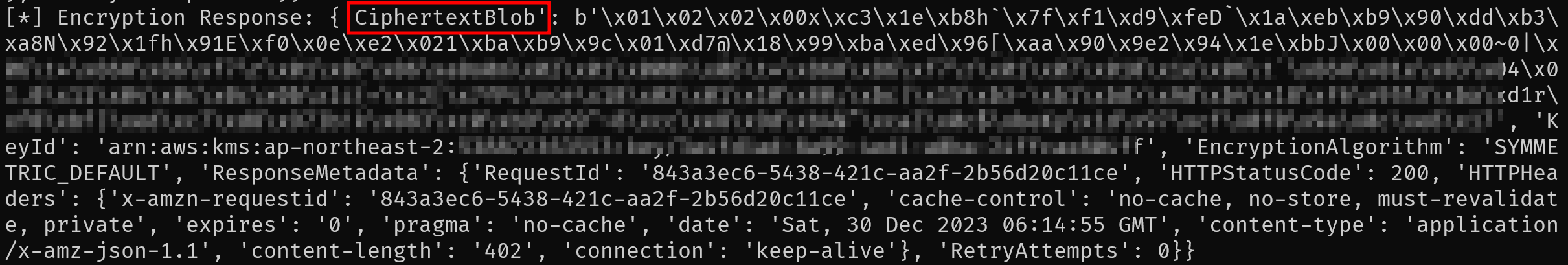 encryption의 반환값에는 암호화된 메시지(CiphertextBlob)가 포함되어있다.