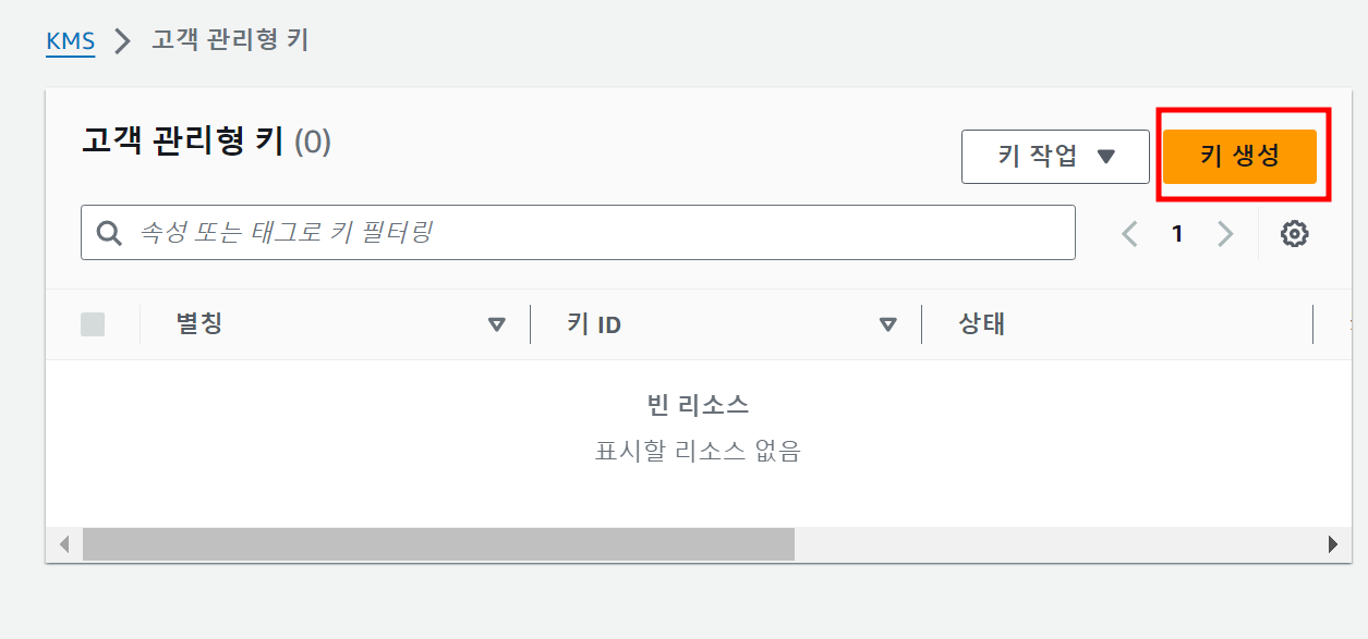 웹 콘솔의 KMS 서비스에서 '고객 관리형 키'를 생성
