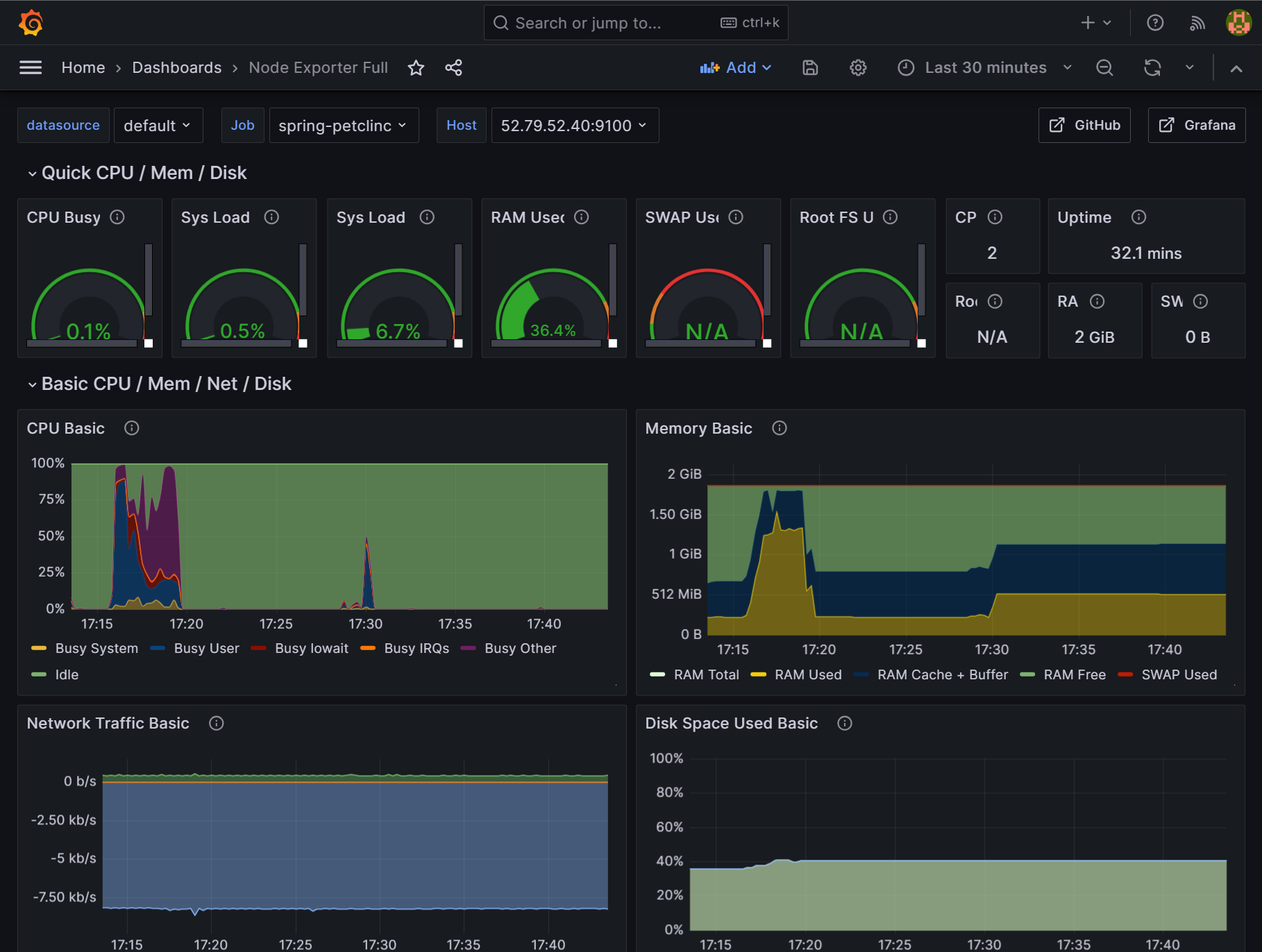 모니터링할 Datasource, job, host 별로 따로 볼 수 있고, 우측 상단에서 모니터링할 시간 범위도 조절가능하다.
