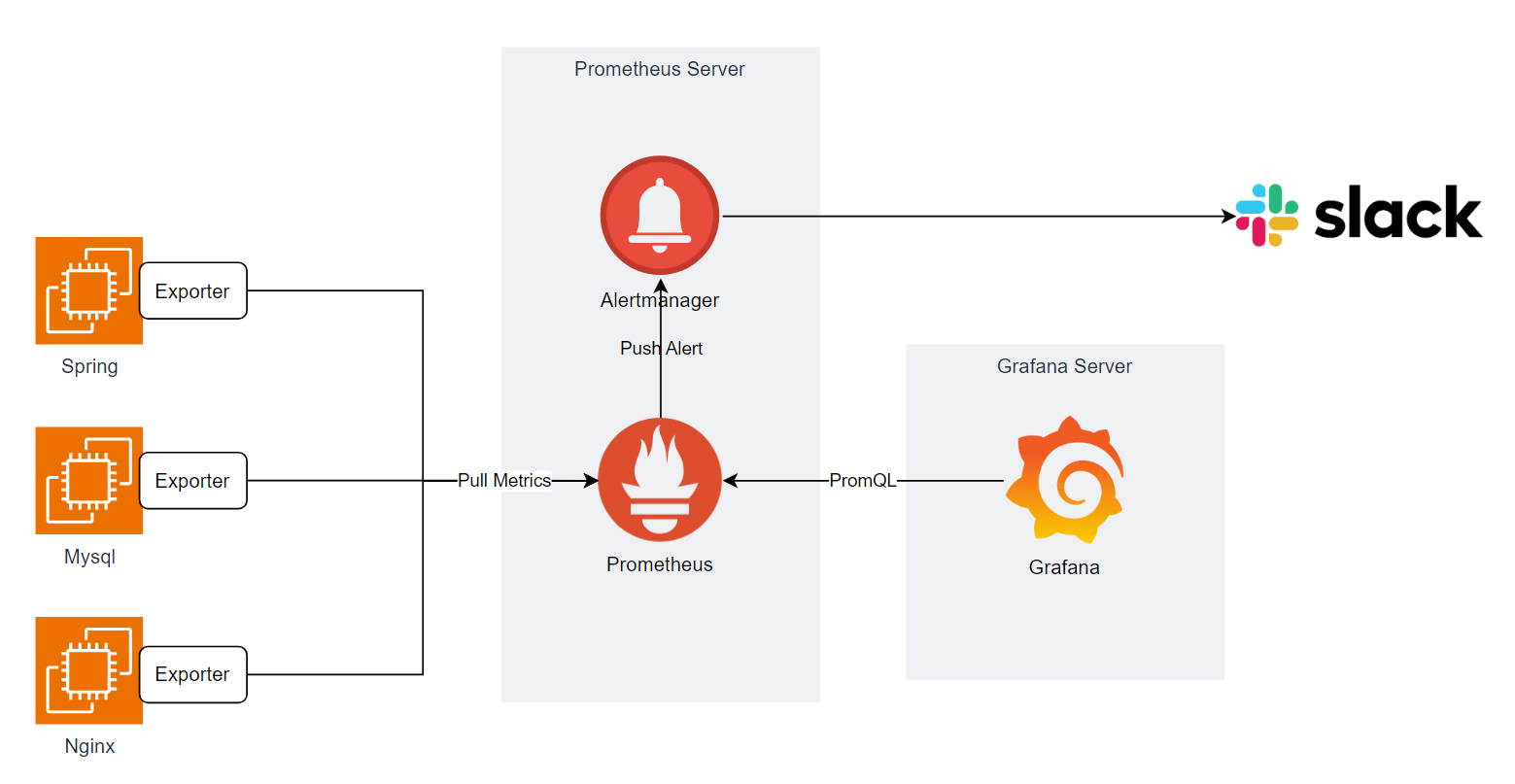 각 노드들의 node-exporter로 부터 Prometheus 서버가 metric을 Pull해오고, Grafana가 Prometheus 서버에 PromQL을 날려 쿼리 결과를 가져와 Dashboard 형태로 보기좋게 구성을 해주게 된다.