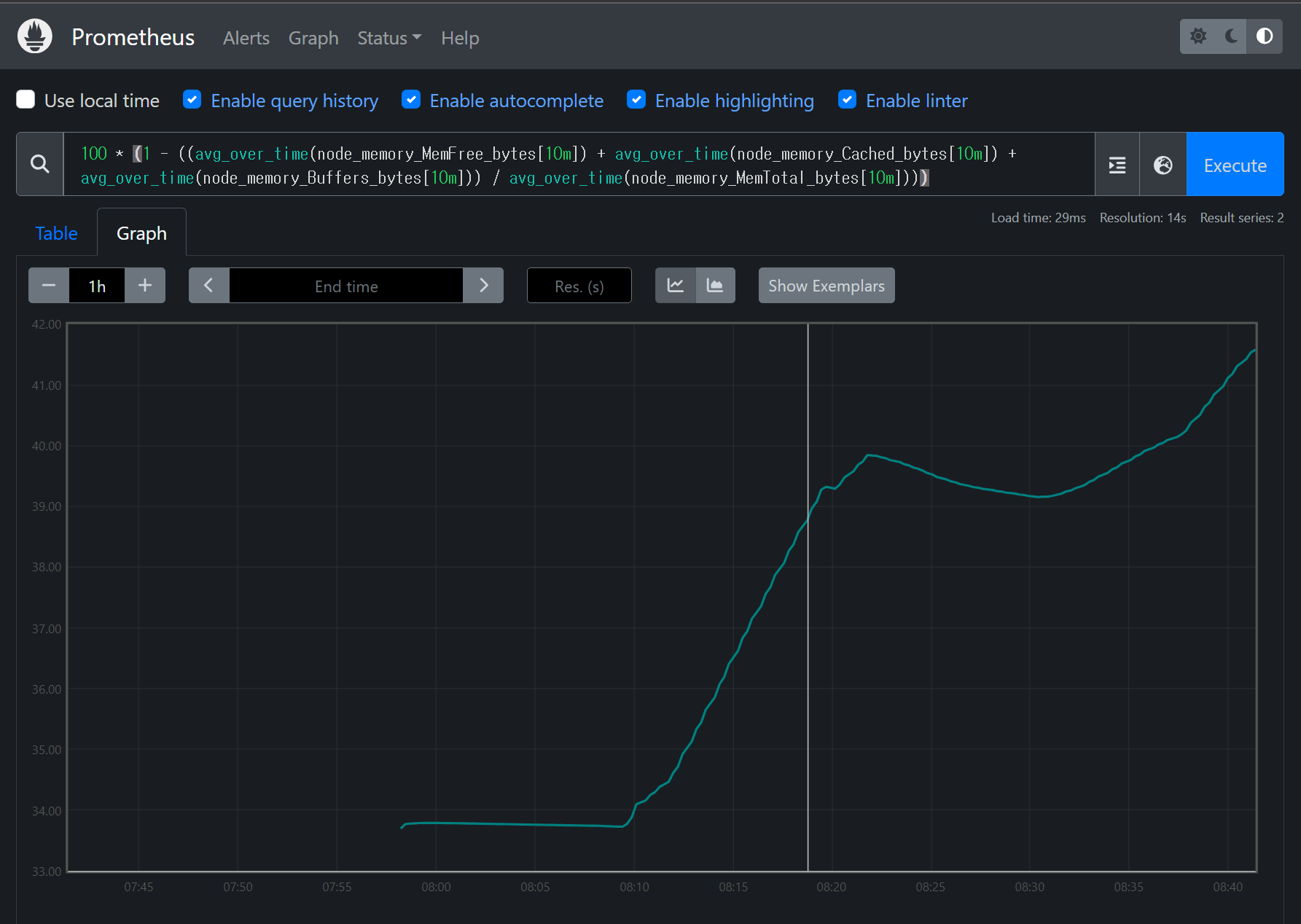 100 * (1 - ((avg_over_time(node_memory_MemFree_bytes[10m]) + avg_over_time(node_memory_Cached_bytes[10m]) + avg_over_time(node_memory_Buffers_bytes[10m])) / avg_over_time(node_memory_MemTotal_bytes[10m])))